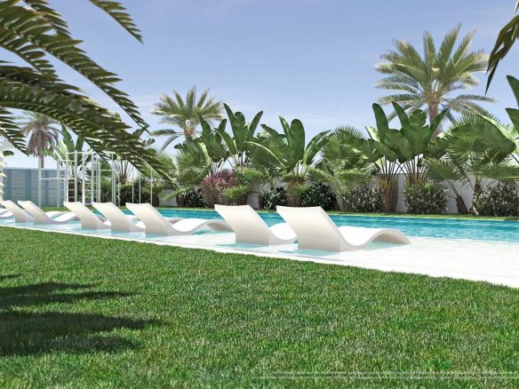 Complejo residencial de obra nueva de bungalow apartamentos con piscina comunitaria en Torre de la Horadada situado a 800m de la playa.
