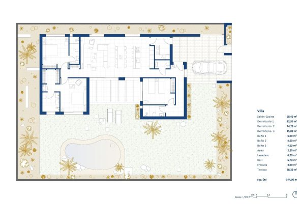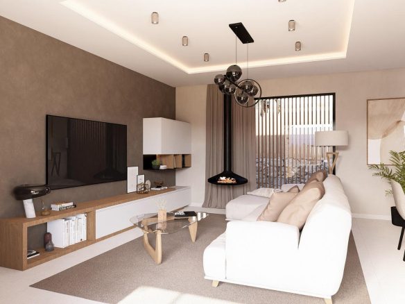 Villas de obra nueva con cocina americana, 3 dormitorios, 3 baños, aseo, terraza, jardín privado con piscina y plaza de garaje.