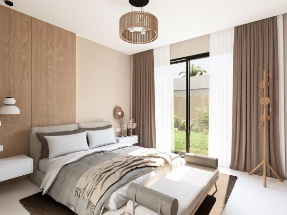 Villas de nueva construcción con cocina americana, 2 dormitorios, 2 baños, aseo, terraza, jardín privado con piscina y plaza de aparcamiento.