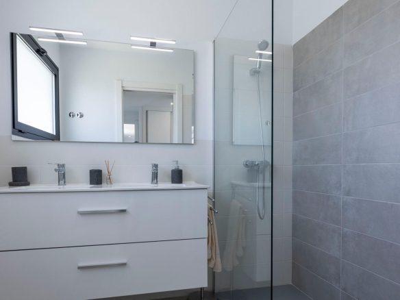 Ventanas de aluminio negro mate, persianas motorizadas, puerta de entrada a la vivienda acorazada, puertas de interiores lacadas en blanco, sistema de aerotermia para producción de agua caliente, encimera de cuarzo (silestone) en cocina, electrodomésticos incluidos, preinstalación de aire acondicionado por conductos.