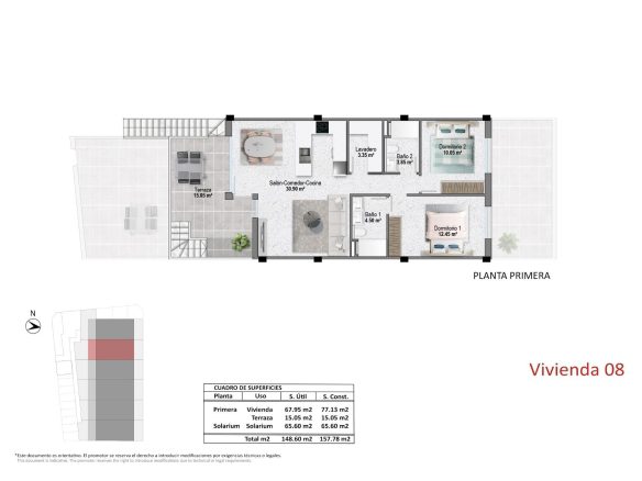 Bungalows en la planta superior con 2 dormitorios, 2 baños y un amplio solárium privado en la azotea, con cocina de verano, pérgola y aseo de invitados.