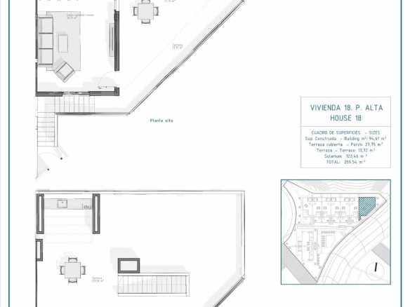 Plantas altas con grandes soláriums que incluyen cocina de verano y pérgola con paneles solares.