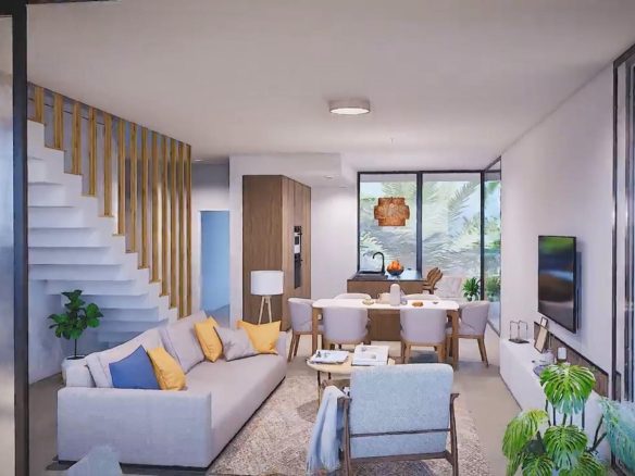 Los apartamentos tienen un diseño moderno, presentando una zona de estar de planta abierta, que combina la cocina, el comedor y el salón, en un gran espacio con acceso a la terraza.
