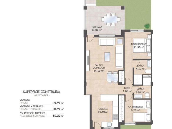 Todas las viviendas son muy amplias y se pueden adaptar a una distribución de 3 dormitorios (opcional con un coste adicional), con electrodomésticos incluidos.
