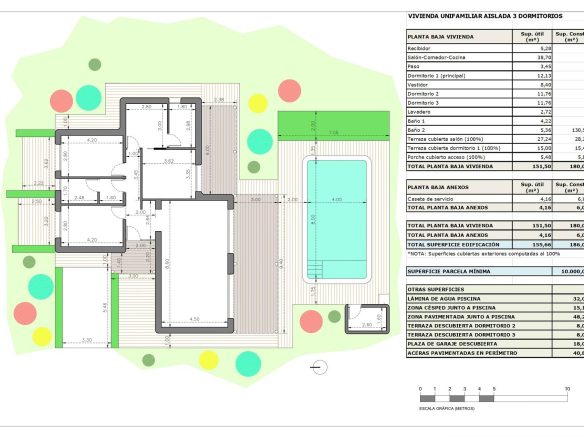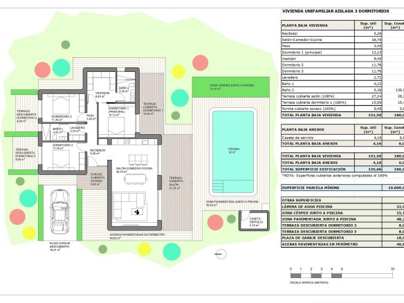 Cada propiedad se encuentra en una zona vallada de aproximadamente 2500 m² dentro de una parcela rústica de 10 000 m², lo que garantiza una gran privacidad y espacio. Las villas incluyen una piscina privada de 8 x 4 m, un porche, un trastero y un aparcamiento exterior privado.