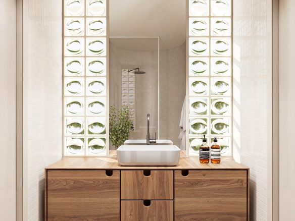 Baños con calefacción por suelo radiante, muebles empotrados con espejos y mamparas de ducha.