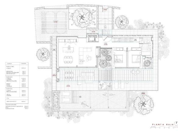 Con una superficie total construida de 716 m² distribuidos en tres niveles (sótano, planta baja y primera planta), la villa ofrece un equilibrio perfecto entre funcionalidad, diseño y comodidad.