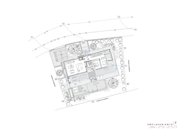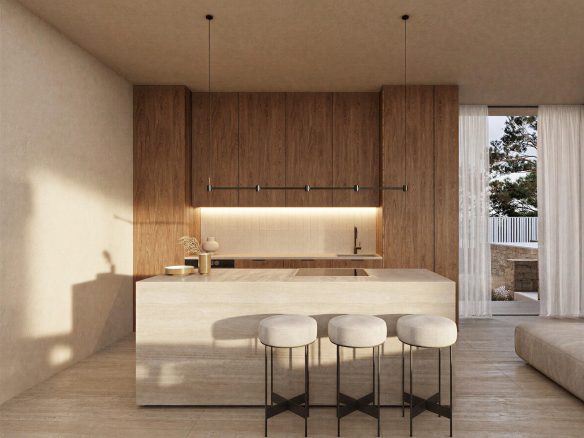 La arquitectura, que combina la calidez mediterránea con la elegancia contemporánea, integra piedra natural, madera y tonos neutros suaves, integrándose a la perfección en el paisaje costero.