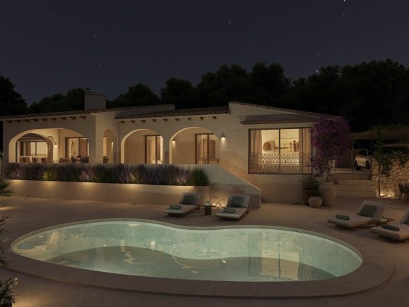 La casa original, con sus paredes encaladas y sus tejados tradicionales, ofrecía la estructura básica de una vivienda mediterránea clásica. Hoy en día, ha sido completamente rediseñada: una reinterpretación escultórica donde convergen la luz, el espacio y la naturaleza. La renovación abrió amplias ventanas, redefinió los espacios e introdujo materiales nobles y táctiles que transmiten comodidad y autenticidad.