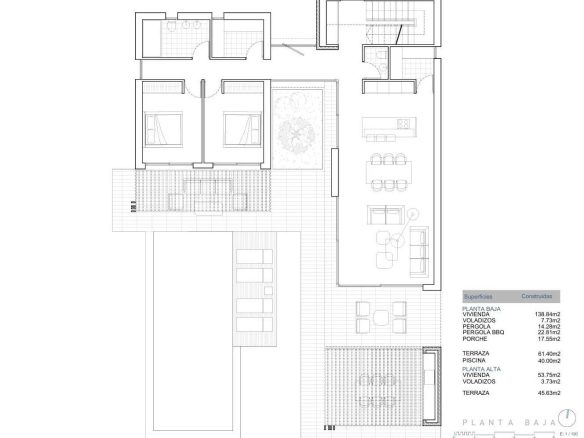 La planta baja incluye dos dormitorios, un baño y amplias zonas comunes. En la planta superior, el dormitorio principal ofrece un refugio privado con baño en suite, un amplio vestidor y una terraza de 45 m2, perfecta para disfrutar de las vistas del amanecer y la brisa mediterránea. El espacio exterior ha sido diseñado para el relax, con una piscina privada, terrazas para tomar el sol y un entorno exuberante que garantiza la tranquilidad y la privacidad.