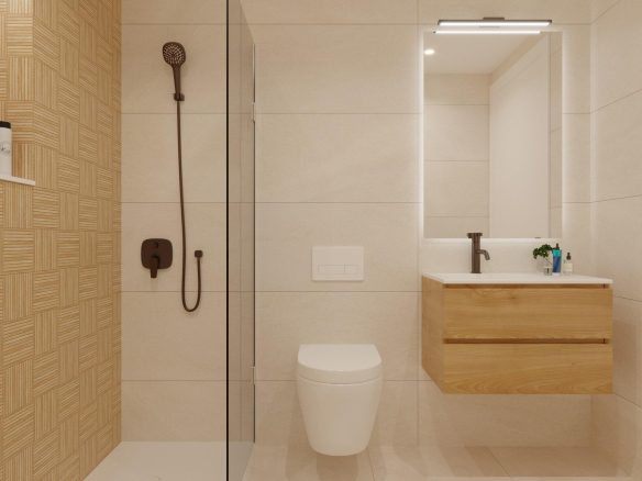 Baños totalmente equipados con muebles, espejos, mamparas de ducha y suelo radiante eléctrico.