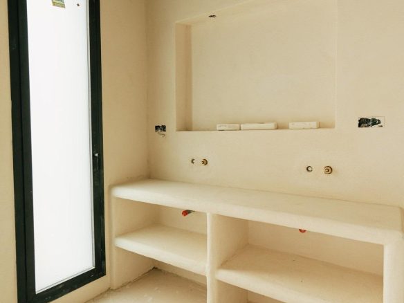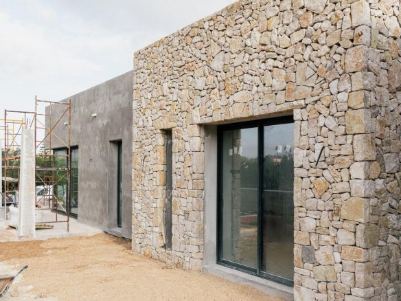La villa destaca por su fachada blanca, sus esquinas redondeadas y los detalles en piedra del Montgó tallados a mano, que le aportan calidez y autenticidad. Los acabados de alta calidad, como los suelos de microcemento, las ventanas de aluminio con doble acristalamiento en colores óxido y los grifos negros en los baños, contribuyen a crear un ambiente refinado y contemporáneo. Todas las habitaciones están equipadas con persianas eléctricas exteriores para garantizar el confort y la privacidad.