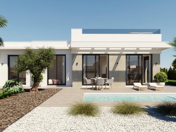 El residencial está compuesto por 17 villas en parcelas a partir de 300 m2. Podrá elegir entre viviendas con 2 o 3 dormitorios y 2 baños completos en una sola planta, además de una zona de terraza con piscina privada de 6×2.4 y un solarium privado en la azotea.