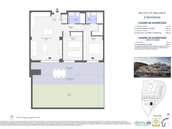El complejo consta de 54 apartamentos de nueva construcción de 1, 2 y 3 dormitorios, cada uno con plaza de aparcamiento privado y trastero incluidos. Las viviendas están diseñadas con una distribución moderna y funcional, aprovechando al máximo la luz natural y ofreciendo amplias terrazas con impresionantes vistas al campo de golf y al mar.