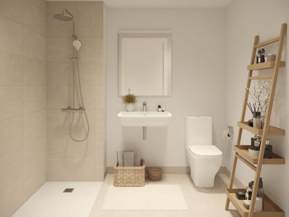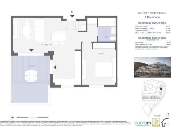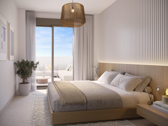 El complejo consta de 54 apartamentos de nueva construcción de 1, 2 y 3 dormitorios, cada uno con plaza de aparcamiento privado y trastero incluidos. Las viviendas están diseñadas con una distribución moderna y funcional, aprovechando al máximo la luz natural y ofreciendo amplias terrazas con impresionantes vistas al campo de golf y al mar.